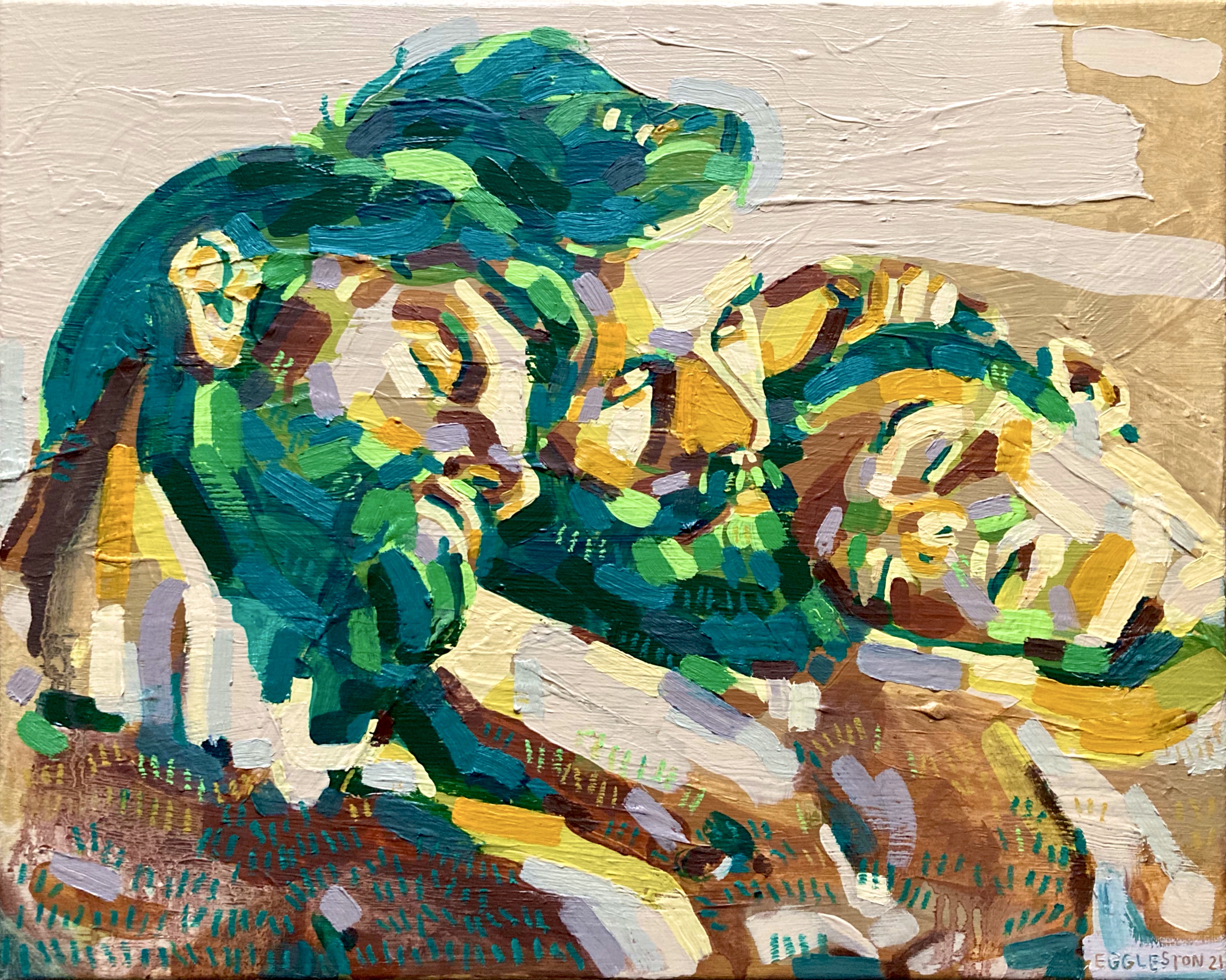 Oil paint, oil pastel, and acrylic paint on stretched canvas