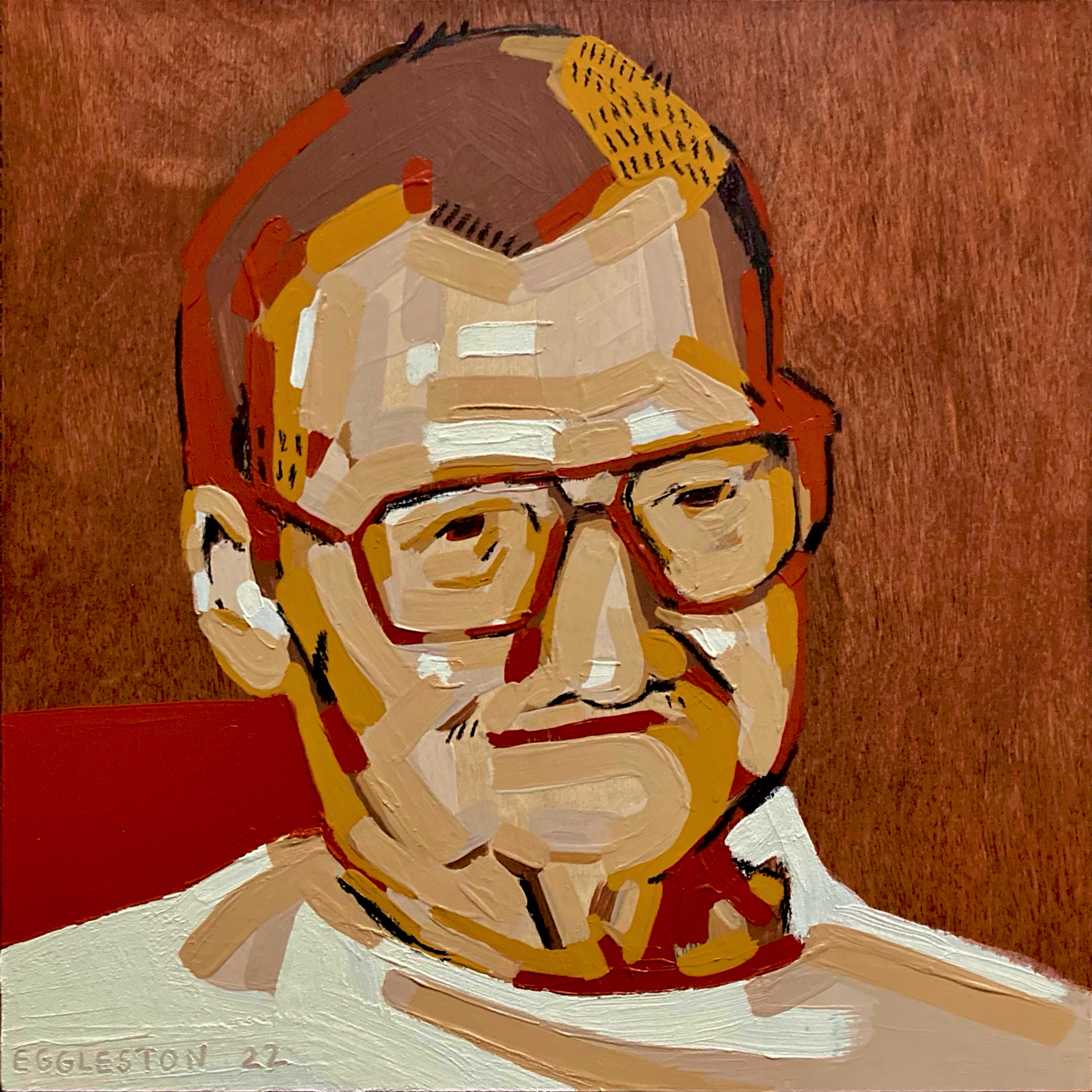 Acrylic paint and wax pastel on panel and wood